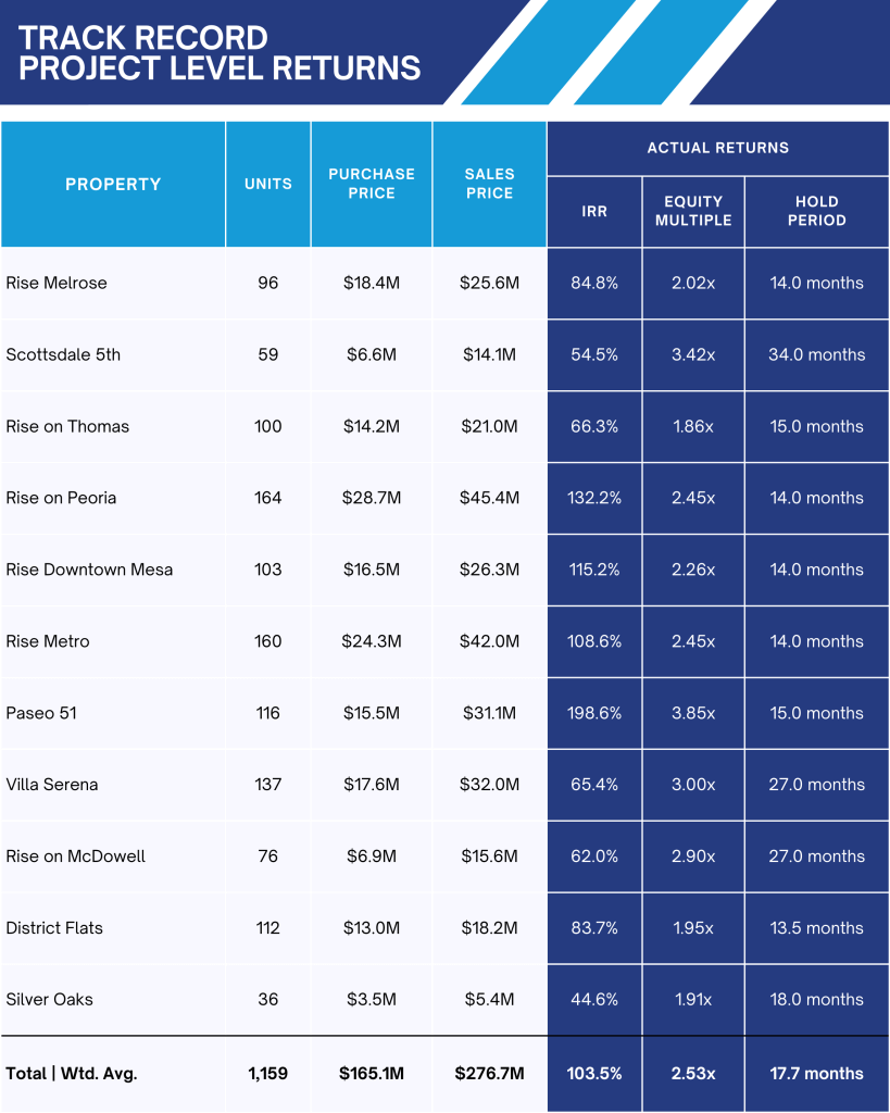 We’ve completed over $2 billion in total transactions and purchased over 55 assets, 10,000+ units since 2019. We have completed 11 full-cycle dispositions and returned capital to investors.